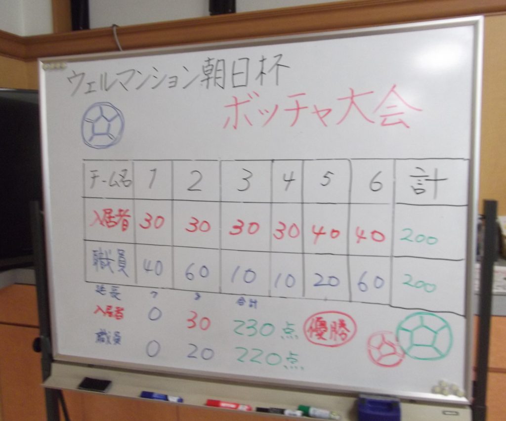 ③第2回ボッチャ大会・・・大接戦で延長戦の末、第1回につづいて入居者チームの2連覇でした。